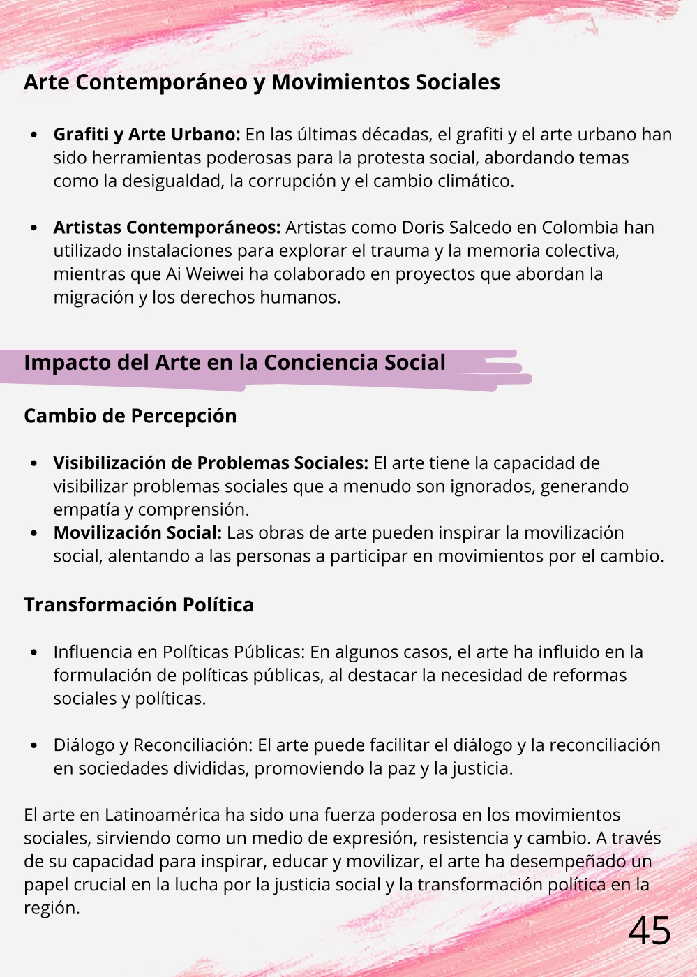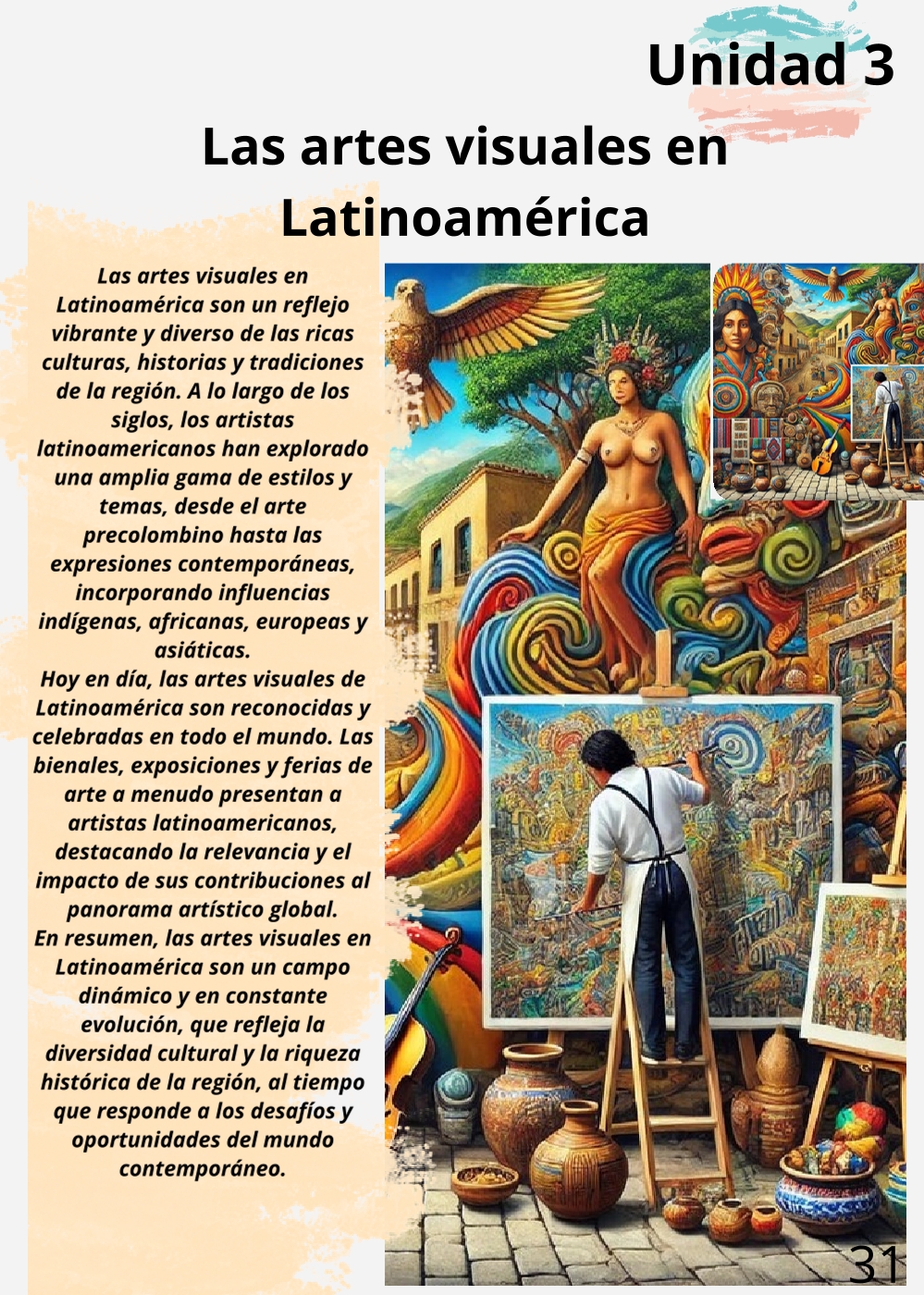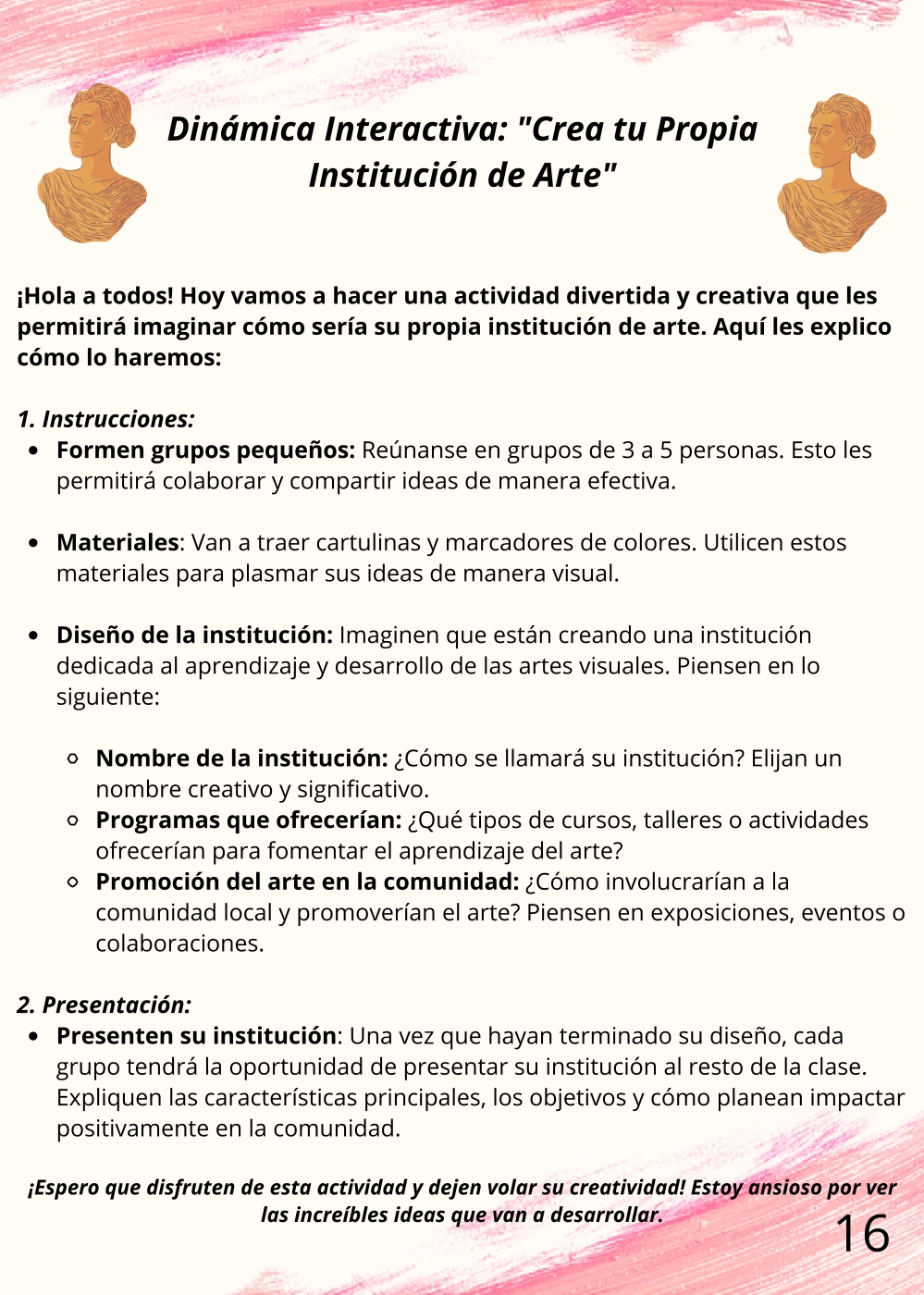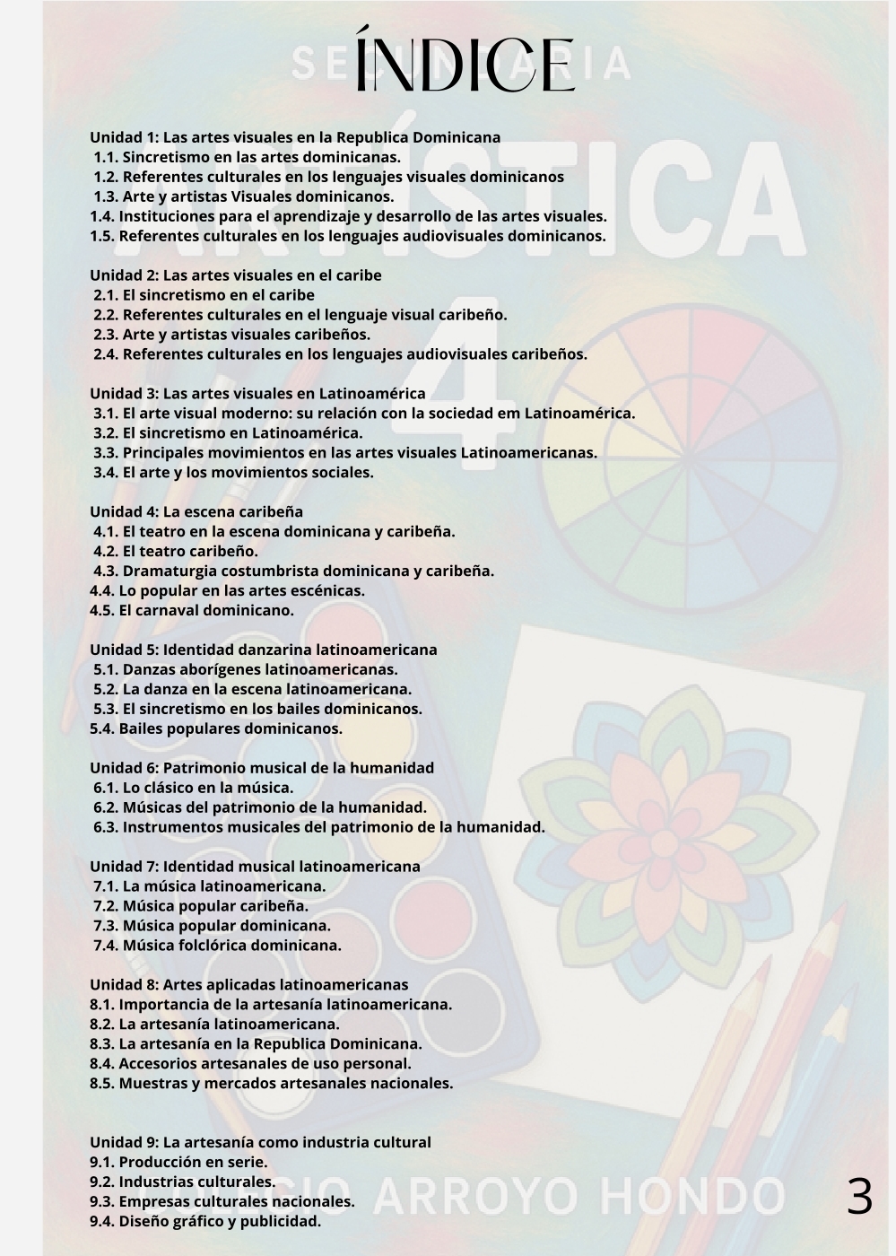 ¡Bienvenidos a un espacio donde la creatividad no tiene límites! Este curso de Educación Artística va mucho más allá del dibujo o la pintura; es una inmersión profunda en la cultura visual y la expresión crítica. A lo largo del año, exploraremos diversas disciplinas artísticas —desde la plástica y la escultura hasta el performance y las artes digitales—, no solo para experimentar con técnicas, sino para analizar el contexto histórico y el impacto social de las obras. Desarrollaremos la capacidad de interpretar mensajes visuales complejos, comprender el papel del arte como motor de cambio y, lo más importante, encontrar y potenciar su propia voz creativa para comunicar ideas y emociones de manera poderosa y auténtica.