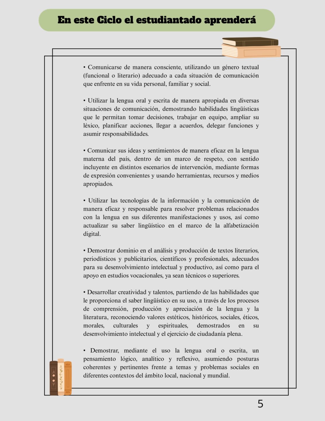 «¡Bienvenidos al nivel superior de Lengua Española! En este 6to grado de secundaria, asumiremos el idioma no solo como una materia, sino como la herramienta definitiva de éxito para su transición a la universidad y el mundo profesional. Nos enfocaremos en perfeccionar la oratoria, la redacción académica de alto nivel y el análisis crítico de las grandes obras de la literatura universal, explorando cómo los autores más influyentes han moldeado el pensamiento humano. Los invito a ver este año como un laboratorio de ideas donde puliremos su capacidad de debatir, investigar y persuadir, asegurándonos de que cada uno de ustedes egrese con una voz propia, poderosa y capaz de liderar cualquier escenario que decidan conquistar.»